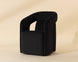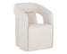 A futuristic wheeled dining armchair featuring cut out arms and a large, comfortable seat. Stocked in moto stucco performance fabric. Performance fabric is moisture repellent, durable and easy to clean.