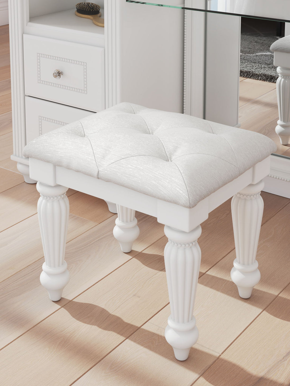 Fit for a princess. This vanity stool’s crisp matte white finish pairs with charming elements like turned legs, ornate beading and sumptuous button-tufted upholstery—perfect for your girly girl. This piece's crowning touches are sure to make your little one feel like royalty.