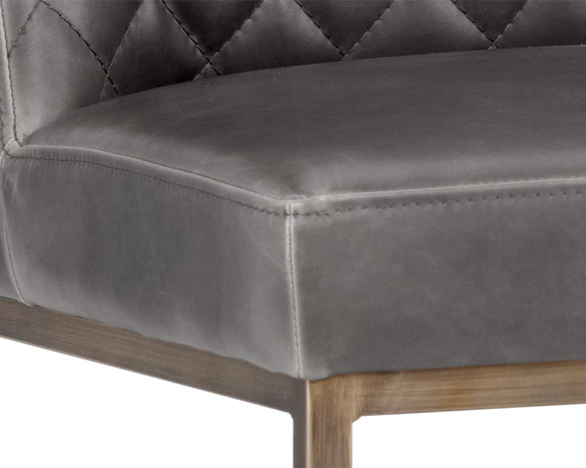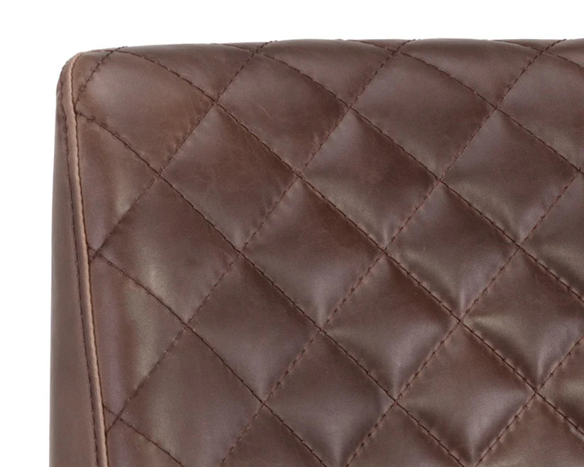 Transform bar and dining spaces with this classic barstool. Stocked in light and dark grey fabric and havana dark brown, coal grey and overcast grey faux leather with diamond stitching on the interior seat back and an antique brass frame steel frame. Suitable for various dining, kitchen and bar spaces of all sizes. Handle With Care: This design has been crafted with faux leather. Faux leather is manufactured to reflect the natural characteristics of leather; as such, colour variations, markings, wrinkles, grooves, and light scratches are appreciated characteristics. No two pieces will be alike. Visit our Product Care page for more information on how to ensure the lasting beauty of this piece.