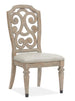 Rooted in Old World design with an updated and relaxed soft Fawn finish, it's hard to surpass the appeal of the elegant Marisol dining collection. Reminiscent of garden gates, a recurring design element is metal fretwork in a graphite finish on case doors and scrolled metal decoration on the hutch, dining curio and the pedestal base of the 65-inch round dining table. Crafted of Pine Solids, timeless and gracious style elements include fluted pilasters, intricate carvings, a shaped foot and dramatic arch shapes on the curio, hutch and huntboard. Three stunning dining case pieces are offered including a buffet curio, buffet with hutch and a huntboard top featuring diagonal planking behind the 3 wood shelves with plate grooves. The three dining tables include a rectangular table, trestle table with a bottom metal stretcher with rosette decorations and the 56-in round table with metal scrolls on the pedestal base. Dining side chairs include two upholstered-seat chairs, one with a wood fretwork back and one with an upholstered back. Beautifully-scaled host chairs in a classic upholstered wing style are offered with a leg or skirt option. Elevate your interiors with the refined style of Marisol.