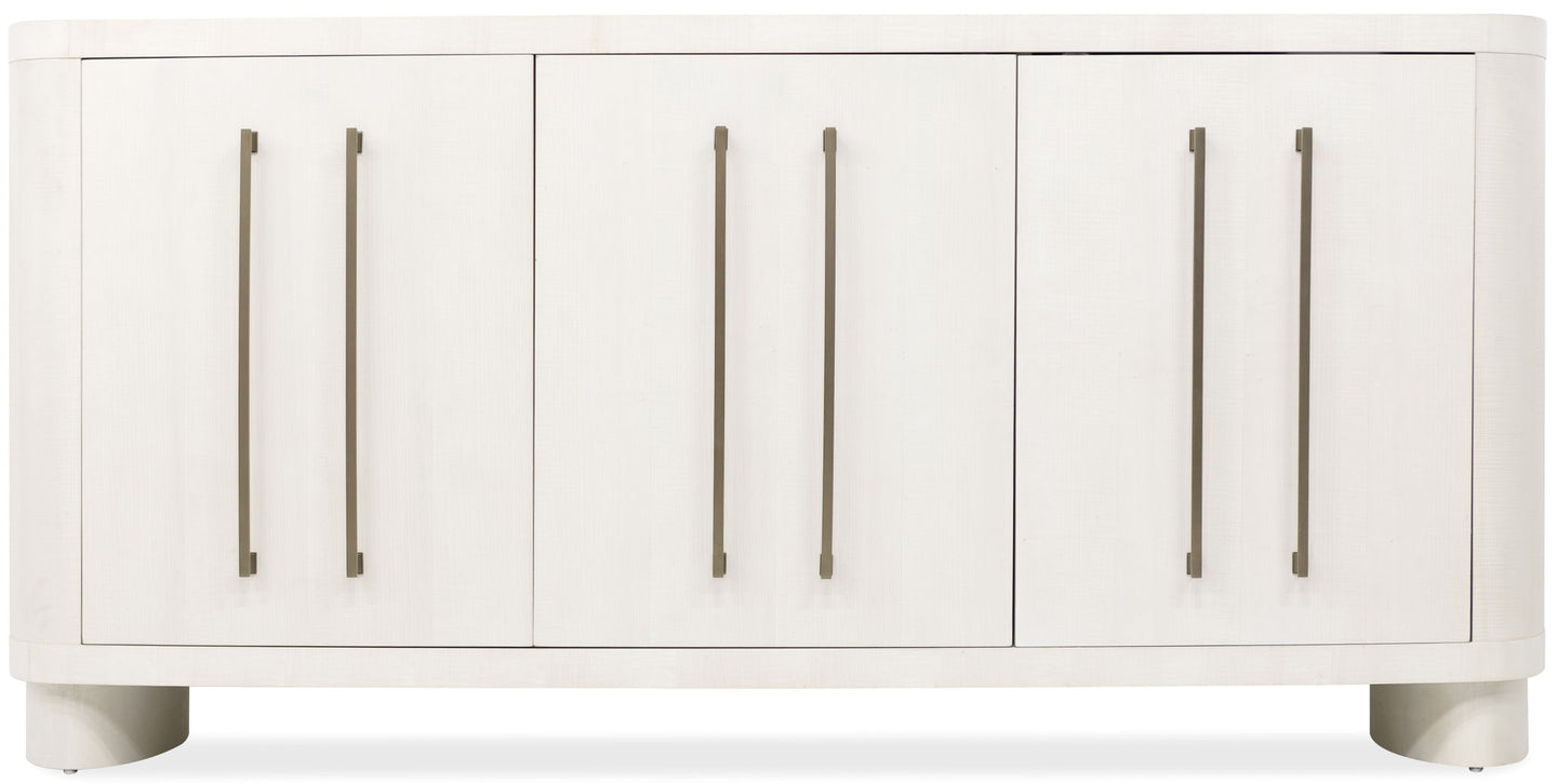 A curvaceous silhouette meets functional elegance in the Bar None Credenza. With soft-close doors, a silverware tray, and ample hidden storage, this piece shines in a crisp white finish over figured maple veneers—perfect for dining rooms or living spaces.