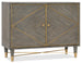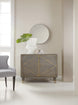 The Breck Chest exudes laid-back luxury with its marriage of an earthy gray finish over Oak Veneers with copper-colored metal accents. The copper finish adorns delicate pull hardware, stretchers and ferrules. Two doors with soft close hinges have one adjustable shelf behind, and a ventilated back panel makes this piece media-ready.