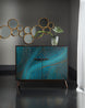 Exciting and elegant, the Esperanza Two-Door Chest is inspired by Mid-Century Modern forms, updated with a vibrant 21st Century color palette. Raised gesso teal paint is accented with gesso gold paint in a swirled pattern for tactile beauty. Crafted of Walnut Veneers with rattan, the Esperanza has one adjustable wood shelf behind each door. Back panel is the same color as the top and sides.