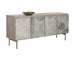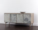 Rich with texture, this unique sideboard illustrates the beauty of mixed materials coming together in harmony. Features a grey solid mango wood frame with slate veneer on the door fronts. Completed with stainless steel legs in a brass finish. Made in India: with refined craftsmanship, this design was brought to life by skilled local artisans. As wood is an organic, porous material, these pieces will contain natural variation of texture and may also exhibit fine indentations and cracks. Wood pieces will also display a disparity of colour and grain, and visible knots and burls that add to the character of each piece.