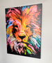 Painted colourful lion canvas 36" wide x 48" high X 1.25" deep. Finish: RGB Multi Shimmer