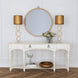 The Logaan Round Wall Mirror, adorned in gold leaf, features a sleek pocket watch bow detail, seamlessly blending modern and traditional styles. Its metal frame, finished in gold leaf with a square edge, adds a touch of sophistication to any space. With a beveled edge and square hanger, this mirror is both stylish and functional, enhancing the ambiance of your room effortlessly.