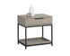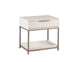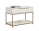A modern nightstand designed to add a beautiful touch to the bedroom. Crafted from cream oak wood veneer with a large soft closing drawer and shelf for added storage. Brushed champagne gold iron hardware completes the look. Can be paired with matching dresser. Also available in charcoal grey oak veneer with a brushed gold iron frame. As wood is an organic, porous material, these pieces will contain natural variation of texture and may also exhibit fine indentations and cracks. Wood pieces will also display a disparity of colour and grain, and visible knots and burls that add to the character of each piece.