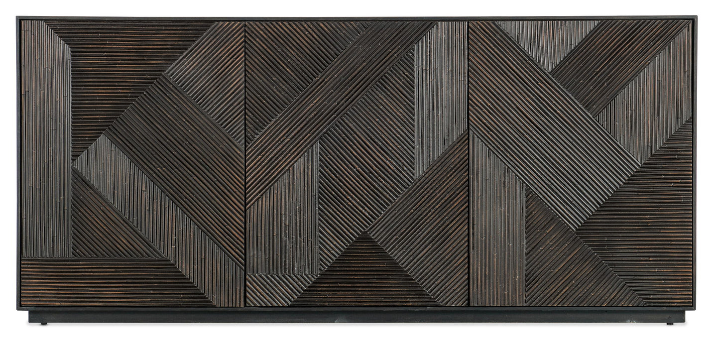 Tranquil and modern with a tropical retreat-inspired vibe, the Retreat Entertainment Center has a striking carved wave motif on the door fronts. Crafted of Oak Veneers and Resin, the case is finished in the Black Sand finish, while the door fronts have a lighter contrasting finish. The entertainment center features three doors with soft-close hinges and touch-latches, two adjustable shelves behind the left door, two adjustable shelves behind the pair of right-side doors, a ventilated back panel and a three-plug electrical outlet located behind the pair of right doors.