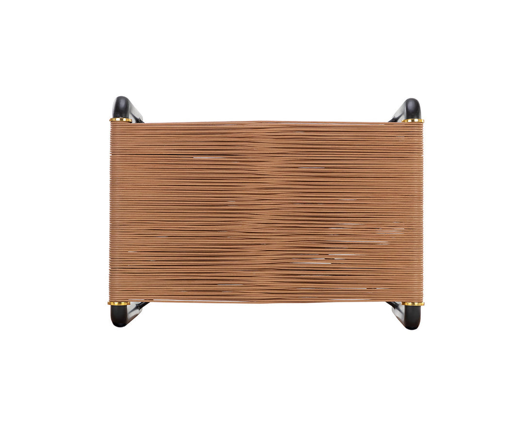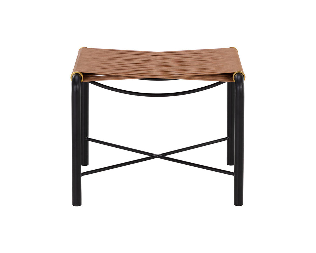 An intriguing stool that is designed with attention to detail. Features a tan leather cord seat with a black steel frame. Powder coated gold accents complete the look. A stunning addition to foyer, living and bedroom spaces. Made in India. With refined craftsmanship, this design was brought to life by skilled local artisans. By nature, these materials develop unique imperfections such as fissures, markings and colour variations for a truly one-of-a-kind piece.