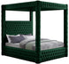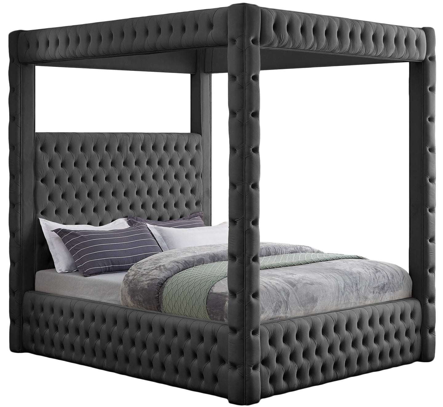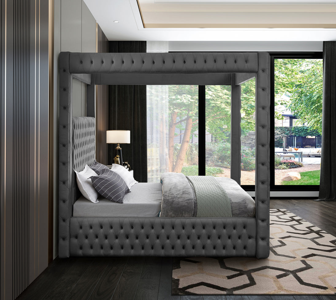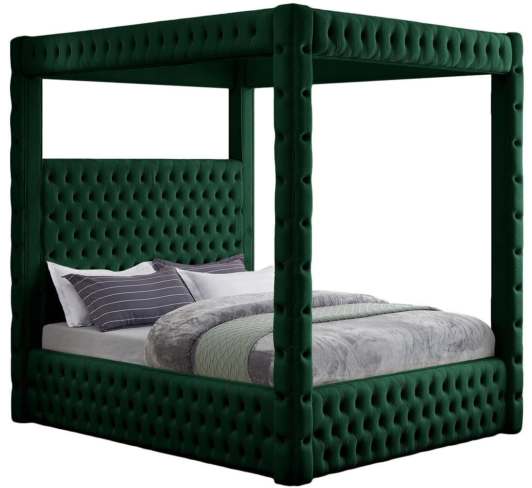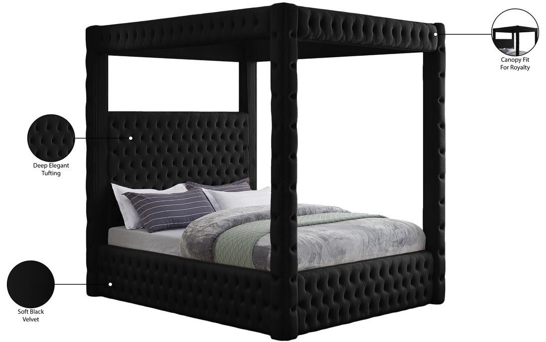 Create a bedroom sanctuary you never want to leave with this Royal velvet bed at its center. Justly named, this bed has a regal look that's fit for a king (or queen). Stunningly crafted, the Royal bed features a canopy that towers over the top of the bed for a modish take on a timelessly affluent design. Deep tufting adds a textural look while the soft black velvet upholstery shores up the bed's sophisticated design.