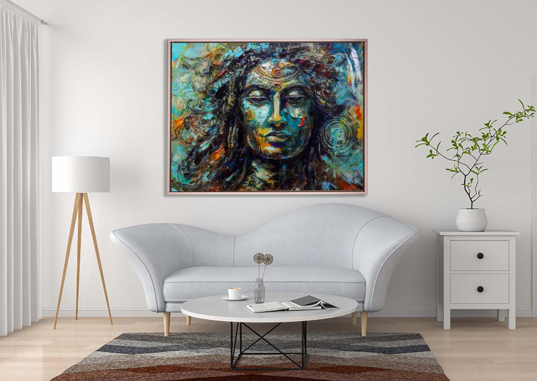This premium product features the captivating image of Lord Shiva captured on a full color canvas. The green and blue tones, with hints of orange and yellow, create a sophisticated and vibrant atmosphere for any space. The print mimics the flowing brushstrokes of oil painting, the face of the image is captivating, conveying peace and strength. Enhance your home with this unique and timeless piece of art.