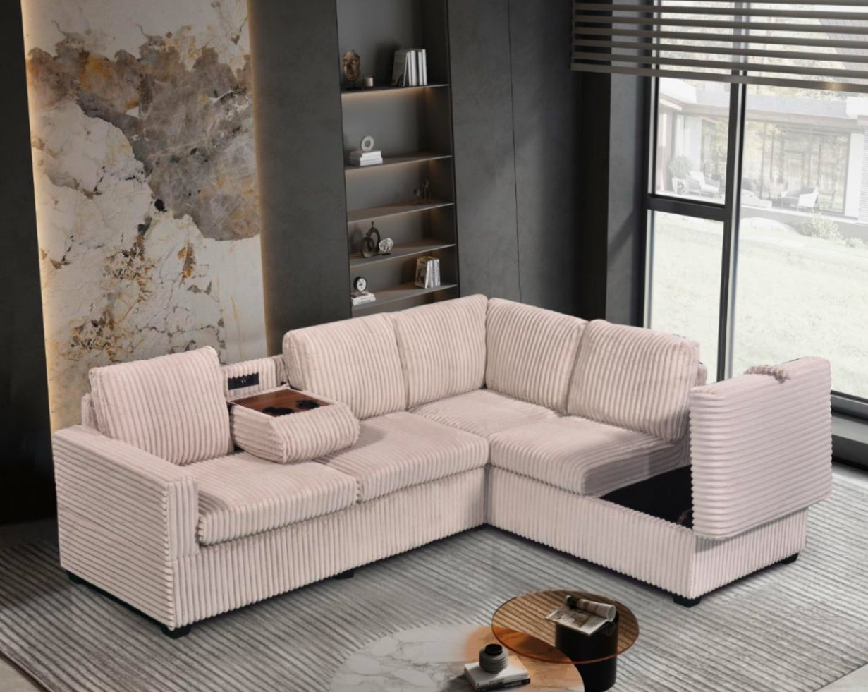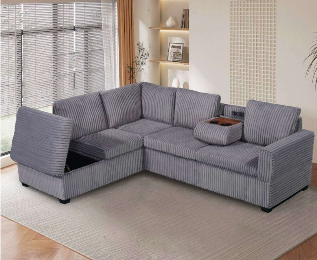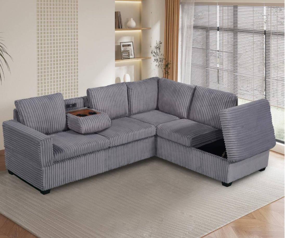 Upgrade your living space with our premium velvet corduroy sectional sofa. Featuring a drop-down console with USB ports and power outlets for easy device charging, plus a spacious storage compartment in the chaise to keep your essentials organized. Enjoy plush cushions and supportive seating for ultimate comfort, all in a modern design that complements any décor. Crafted with high-quality materials for durability, this sofa combines luxury and functionality for the perfect living room upgrade at Furniture Depot.