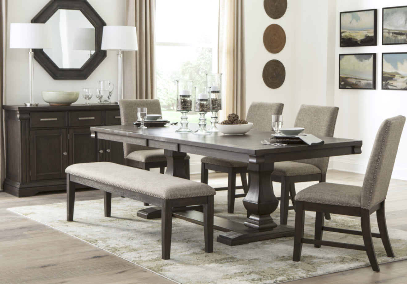 An elegant blend of traditional styling and rustic aesthetic combines to create the look of the Southlake Collection. The rectangular tabletop is supported by a double pedestal base, it’s urn profile lending distinct accent to your dining room. The wire-brushed rustic brown finish highlights the oak veneer. The brown linen-covered seats and backs of the side chairs provide complementing contrast to the table. An available bench provides an alternate seating option.
