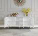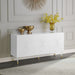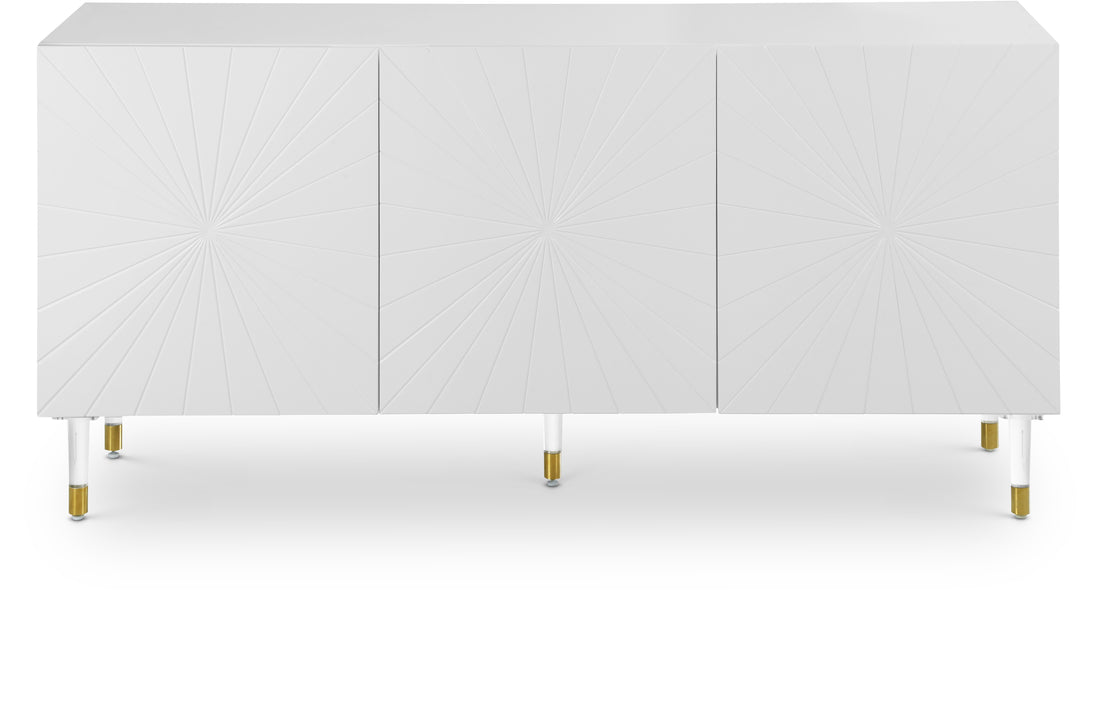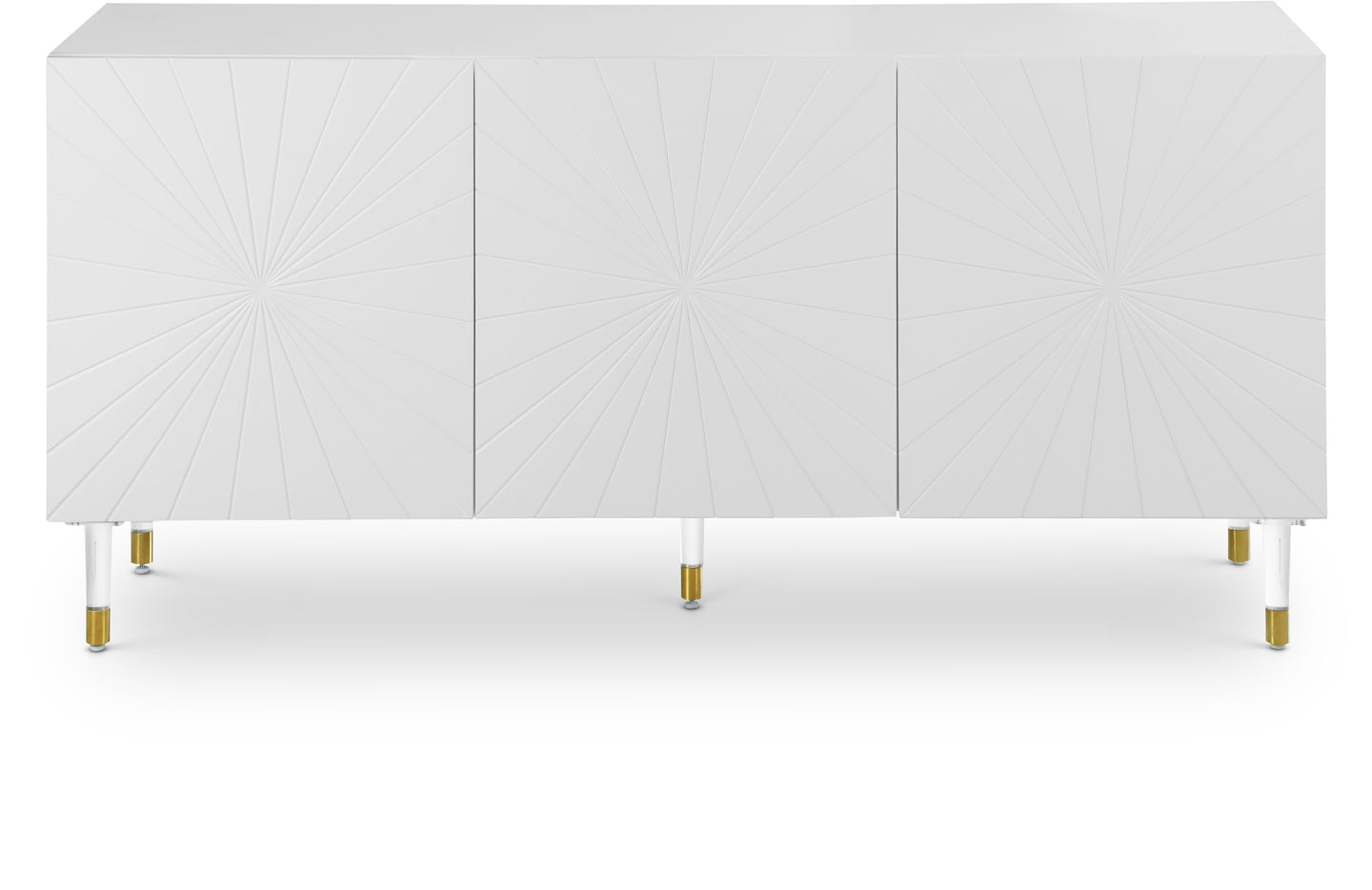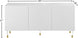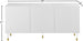 Make a bold statement in your living space with this eye-catching Florence Sideboard/Buffet from Meridian Furniture. Its white lacquer is complemented by a gold finished base, creating a contemporary design that's both modern and stylish. Four side cabinet doors open up to reveal four cubby spaces, giving you ample room to safely tuck away dishes, pots and pans, knick-knacks, books, or other household items, while the top of the sideboard/buffet doubles as shelf space for items you want on display.