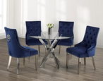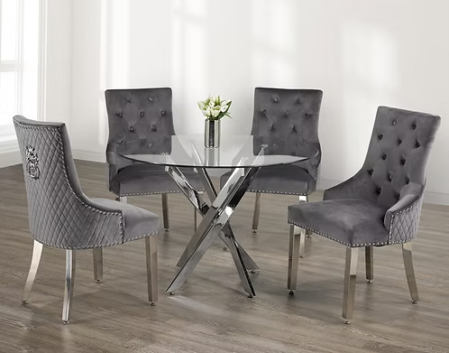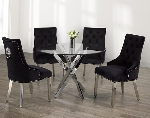 Make a powerful statement with the Royal Lion Dining Collection. Featuring a sleek 10mm tempered clear glass tabletop and sturdy chrome legs, this set brings a modern, open feel while letting the chair design take centre stage.